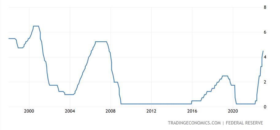 Navýšením úrokové sazby o 0,5 procentního se hodnoty pohybují v rozmezí 4,25 – 4,5 %. To jsou nejvyšší úrovně za posledních 15 let. Tím pádem jsou aktuální hodnoty již na vskutku restriktivních úrovní. A během následujícího roku bychom již měli sledovat kumulativníefekt vyplývajících z restrikcí, které Fed provedl.