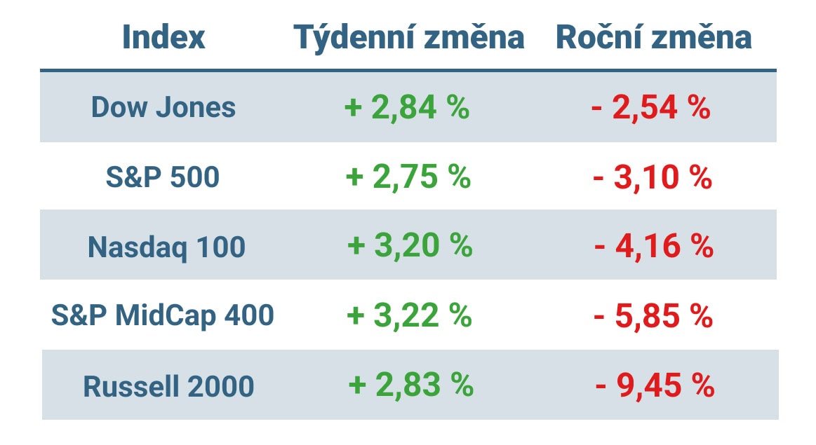 Tabulka ukazuje vývoj nejvýznamnějších amerických indexů v tomto týdnu a v roce 2025