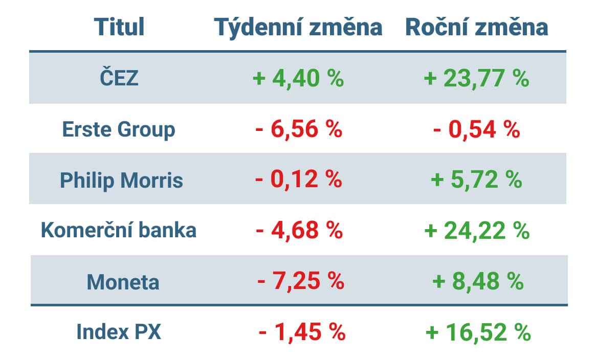 Vývoj ceny nejvýznamnějších titulů obchodovaných na pražské burze v tomto týdnu a v roce 2025