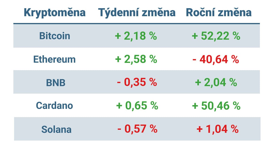Další významné kryptoměny Cardano, Solana a BNB se pak v týdenním srovnání obchodovaly téměř beze změny.