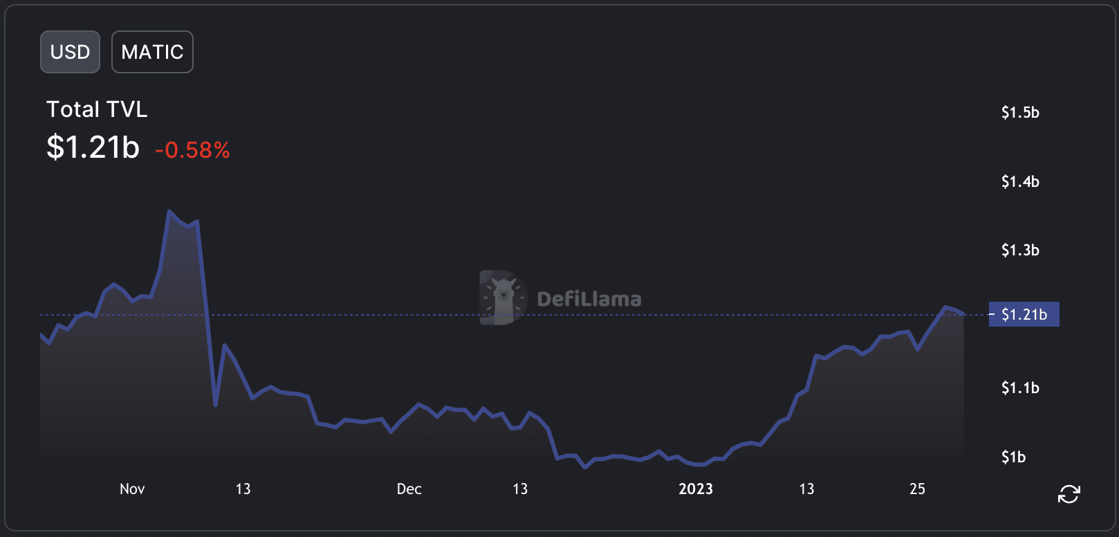 On-chain aktivita na Polygonu od začátku roku výrazně vzrostla. Celková uzamčená hodnota (TVL) v DeFi na Polygonu vzrostla od 1. ledna téměř o 20 % a podle DeFiLlama aktuálně činí 1,21 miliardy dolarů.