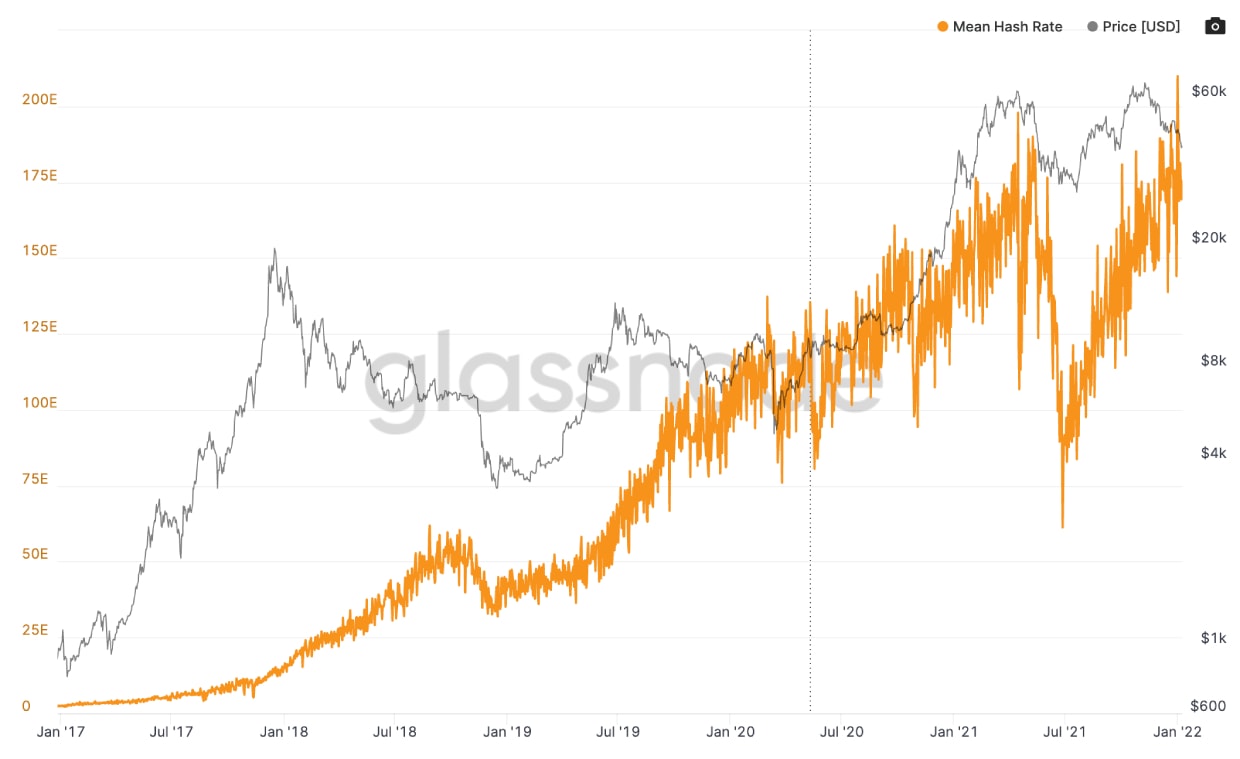 Bitcoin byl bezpečný jako nikdy předtím poté, co se 2. ledna podle údajů analytického nástroje Glassnode hashrate sítě vyšplhal na nový rekord 203,5 exahashů za sekundu.