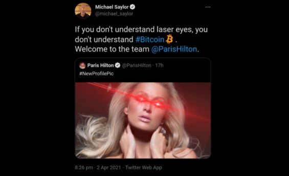 Laserové oči byly trendem, který měl spojitost s Bitcoinem. Někdo přišel s nápadem, dát si na profilovou fotku na Twitteru laserové oči a nechat je tam, dokud cena BTC nedosáhne 100 000 dolarů.
