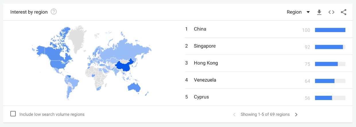 Největší podíl na vyhledávání NFT v celosvětovém měřítku má Čína. Zajímavé je, že k tomu dochází i poté, co oficiální představitel Čínské lidové banky varoval před rychle rostoucím zájmem o NFT a aktivity související s metaverzi s odkazem na obavy z praní špinavých peněz.