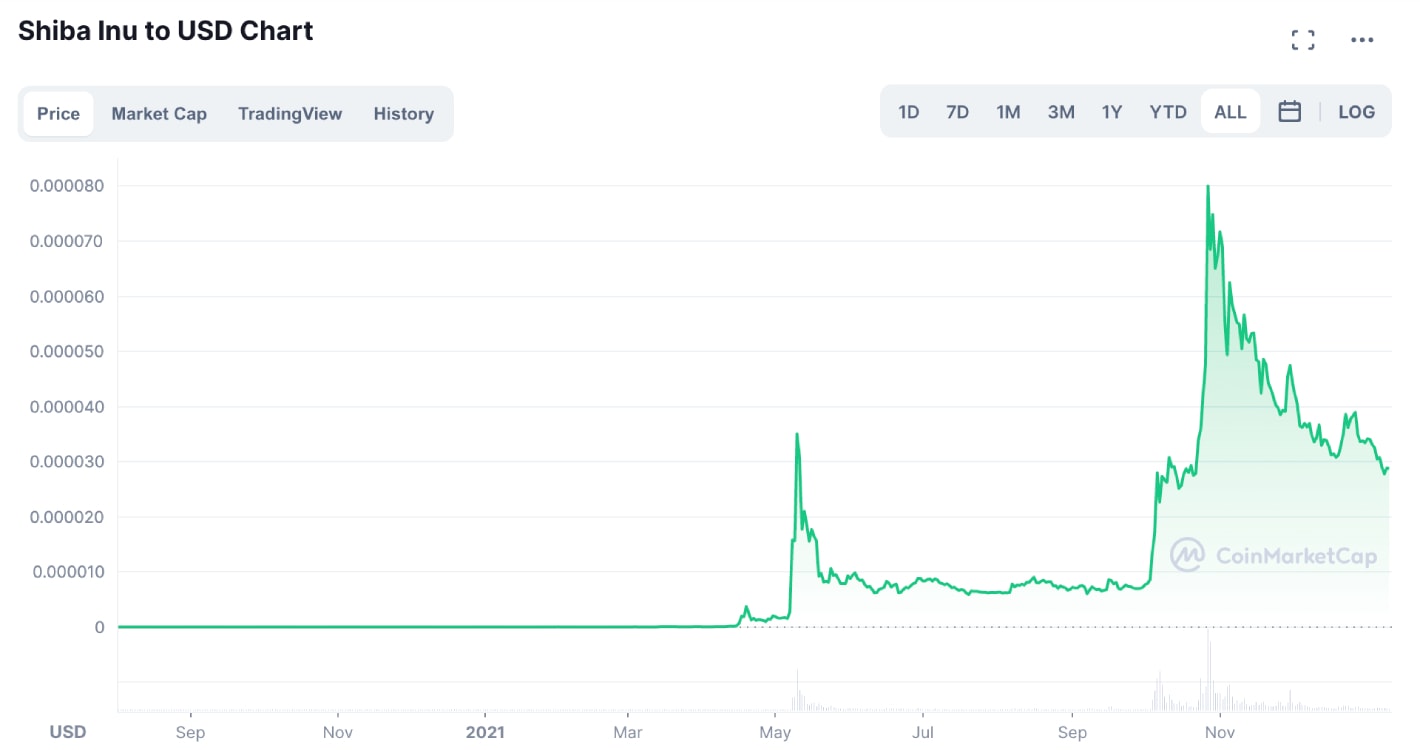 Dalším z nejzářivějších příkladů “úspěšných” memecoinů v roce 2021 je rozhodně token Shiba Inu (SHIB). Tento samozvaný “zabiják Dogecoinu” je jednou z nejvýkonnějších kryptoměn loňského roku, přičemž se objevilo několik příběhů lidí, kteří si před rokem koupili pár tokenů za pouhých 100 dolarů a o pár měsíců poté se stali multimilionáři. Přestože je momentálně 60 % pod svým historickým maximem, jen za posledních 12 měsíců SHIB vzrostl o 44 636 200 %.
