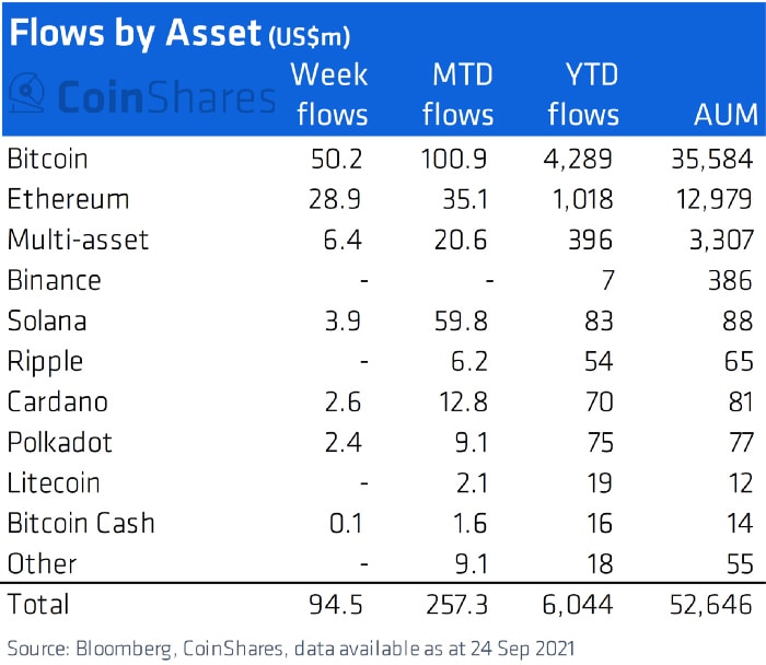 Nejúspěšnější byl Bitcoin s týdenním přílivem kapitálu ve výši 50,2 milionu dolarů. Investory silně přitahovalo také Ethereum, do kterého vložili téměř 29 milionů dolarů. Následoval koš různých aktiv (6,4 milionu), Solana (3,9 milionu), Cardano (2,6 milionu) a Polkadot (2,4 milionu).