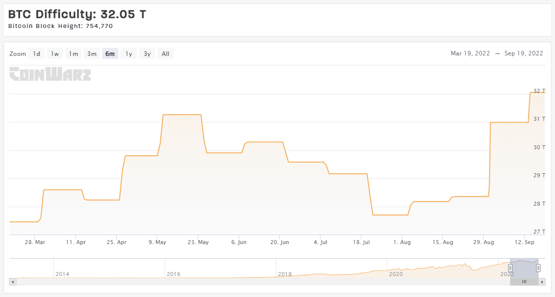 V letních měsících, kdy bylo mnoho těžařů offline, zaznamenala obtížnost těžby několik po sobě jdoucích úprav směrem dolů. Situace se změnila 31. srpna, kdy došlo k největší úpravě směrem nahoru od ledna letošního roku, jak dokládá následující graf.