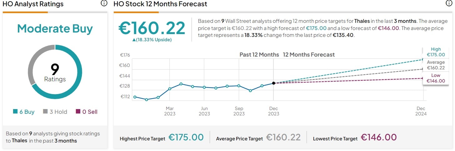 Akcie Thales podle analytiků z Wall Street mají před sebou minimálně dvanáct měsíců růstu. Toto stanovisko zaujalo všech devět analytiků, kteří se na cenové predikci podíleli. Podle pozitivních predikcí by akcie Thales měly dosáhnout hodnoty 175 USD. Podle konzervativního scénáře by akcie měly růst k hodnotě 160 USD. Cenový cíl podle negativní predikce činní 146 USD za akcii, nicméně s cenovým poklesem analytici nepočítají.