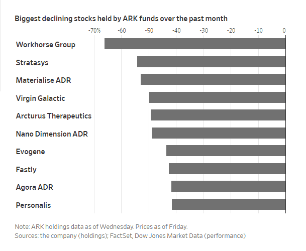 A první náznaky neúspěchu na sebe nenechaly příliš dlouho čekat. Všech 5 ETF fondů společnosti ARK Invest od začátku února spadly alespoň o 23 %, největší fond ARK Innovation spadl nejvíce – ze svého maxima šestnáctého února k osmému březnu, kdy cena dosáhla dna, činil pokles 31 %.