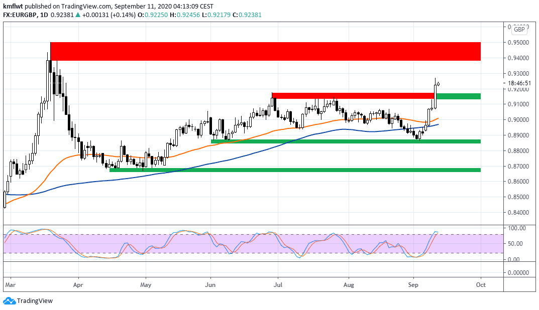 Forex pár EUR/GBP se od června 2020 pohyboval v pásmu od 0.88500 do 0.9150. Ve čtvrtek 10. 9. 2020 došlo k proražení horního pásma a podle analýzy na denním časovém rámci to vypadá, že pár má volný prostor až k ceně kolem hodnoty 0.94, kde se obchodoval v březnu tohoto roku. Rostoucí tendenci potvrzují rovněž klouzavé průměry EMA 50 a SMA 100, které jsou již od března v býčí konstelaci.