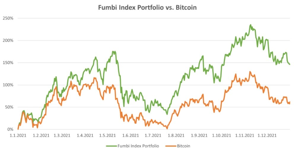 Fumbi porovnalo výkonnost svého Indexového fondu s Bitcoinem od začátku roku 2021 a vykázalo poměrně zajímavé výsledky. Zatímco cena Bitcoinu v tomto období vzrostla o 62,34 %, indexové portfolio dosáhlo návratnosti 146,23 %. Nutno podotknout, že se kryptoměnový trh v tomto období nacházel v bull marketu, během kterého altcoiny historicky Bitcoin svou výkonností překonávají. Z historie pak víme, že v obdobích medvědích trhů naopak vítězí nejstarší a největší kryptoměna.