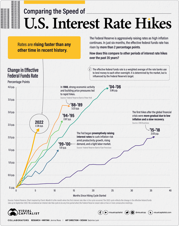 Asi jako nejdůležitější věcí začneme základními úrokovými sazbami. Úrokové sazby jsou naprostým gró, co se tyká finančního trhu a ekonomiky. Jelikož je to základní regulační prvek, který má díky operacím na volném trhu ve své gesci plně centrální banka. V tomto případě mluvíme samozřejmě o Federálním rezervním systému (Fed). Proč je to nyní tolik důležité? Fed už téměř rok v kuse zvyšuje základní úrokovou sazbu. Avšak aktuální cyklus růstu základní úrokové sazby je vůbec nejrychlejší za předešlých několik dekád.