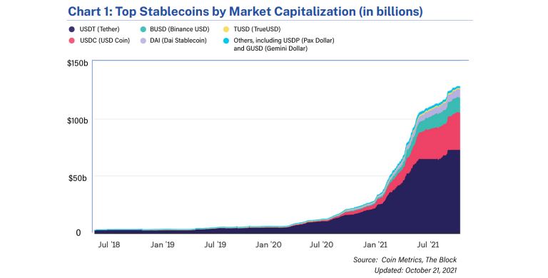 Fakt, že popularita těchto mincí narůstá, dokládá graf níže. Celková tržní kapitalizace stablecoinů se jen za poslední rok pětinásobně zvýšila. Částka šplhá k úrovni 150 miliard dolarů.