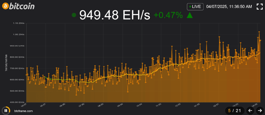 Poznamenal, že 30denní klouzavý průměr hashratu Bitcoinu se stále pohybuje kolem 0,845 ZH/s.