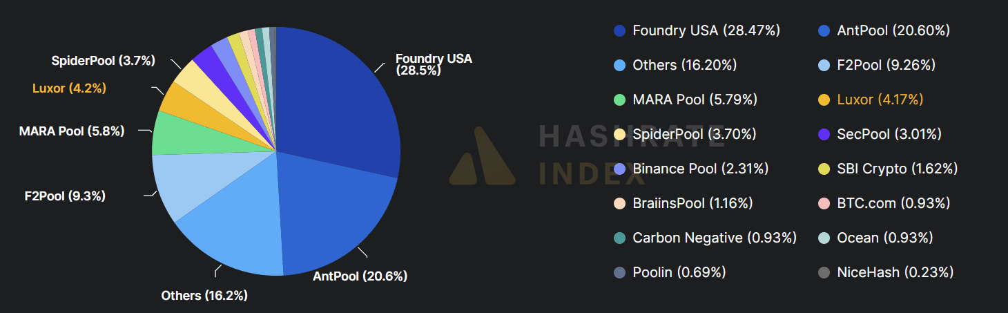 Největší podíl na hashrate mají podle Hashrate Indexu těžební pooly, jako je Foundry USA Pool a AntPool.