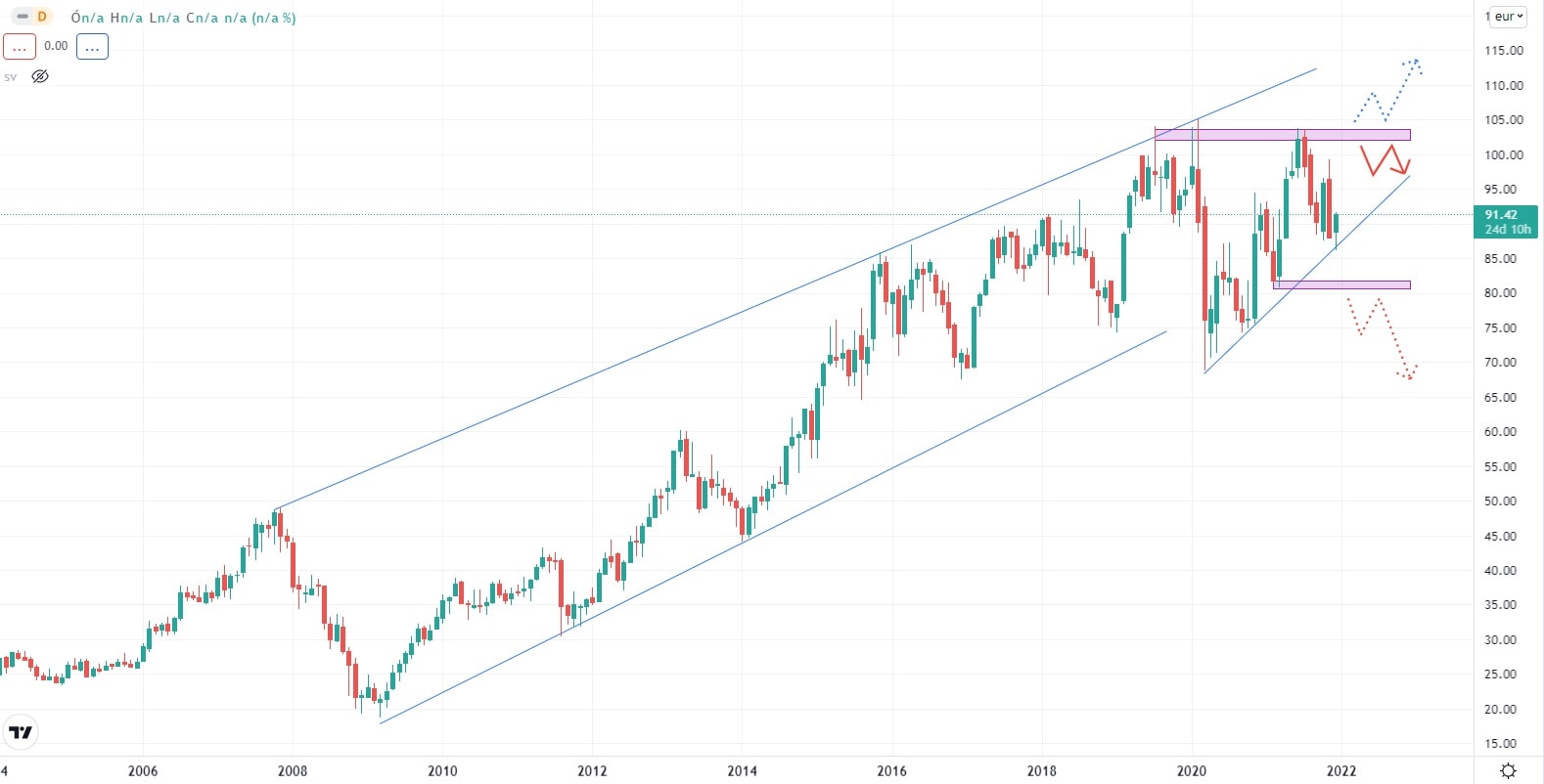 Akcie Heineken se dlouhodobě obchodují v rostoucím trendovém kanálu s minimálním výskytem rezistentních zón. Ovšem bez tvorby nových, dlouhodobých maxim.