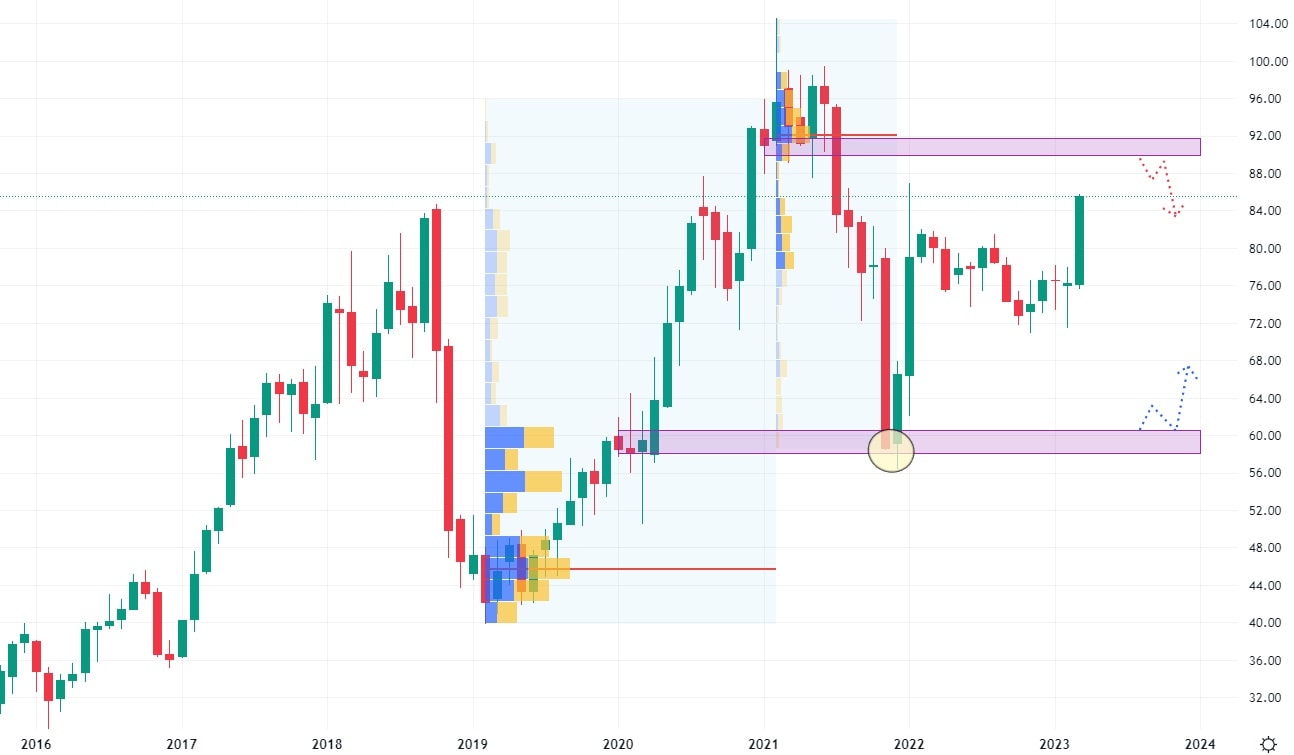 Tato známá společnost vyvíjí a vydává zábavný obsah především pro video konzole, osobní počítače a mobily. Po akciovém pádu v roce 2022, kdy společnost vykázala výrazný pokles svých tržeb to vypadá, že se začíná blýskat na lepší časy. Akcie Activision Blizzard na meziroční 15% pokles tržeb již zapomněly a vyrazily vzhůru. Nejbližší rezistence se nachází na hodnotě 90 USD, kde se nachází nejsilnější volume z přelomu let 2021 a 2022.