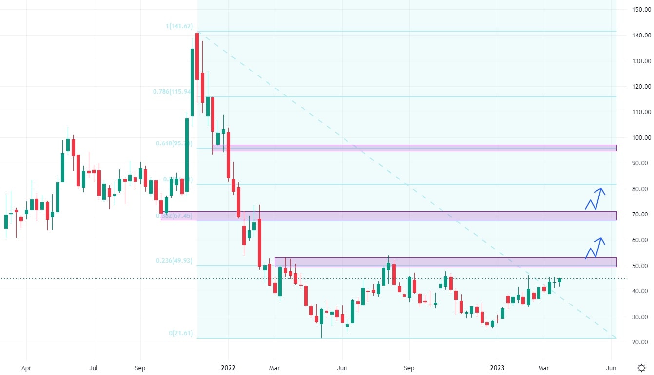 Akcie Roblox se celý loňský rok pohybovaly v postranním trendu na svých minimálních cenách. Tato oscilace okolo hodnoty 35 USD za akcii by mohla být ukončena v případě, že trh prorazí hodnotu 50 USD, která tvoří horní hranu tohoto postranního trendu. Na vyšších cenách ovšem trh narazí na silné rezistentní úrovně, které jsou navíc podpořeny konfluencí v podobě Fibonacciho retracementu. Do trhu by musel přijít velmi silný fundamentální impuls, aby byly tyto úrovně trhem ignorovány.