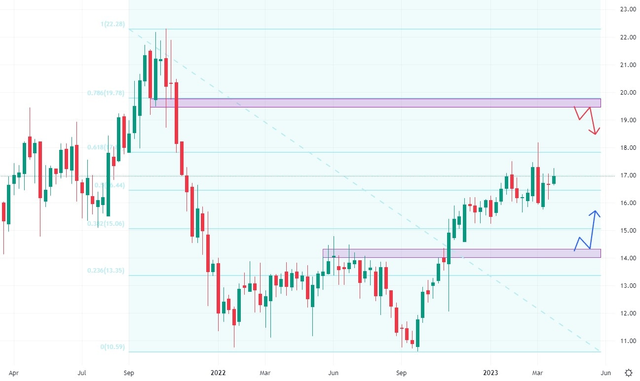 Akcie SciPlay po vytvoření svého cenového dna v roce 2022 dokázaly vyrůst již o 70,5 %. Při tomto růstu dokázaly také pokořit úroveň 14 USD, což byly cenová maxima v roce 2022. Tato cena nyní na trhu funguje jako support. Pokud akcie porostou i nadále, nejbližší rezistence se nachází až na ceně 20 USD, kde může nastat první výrazná prodejní aktivita.