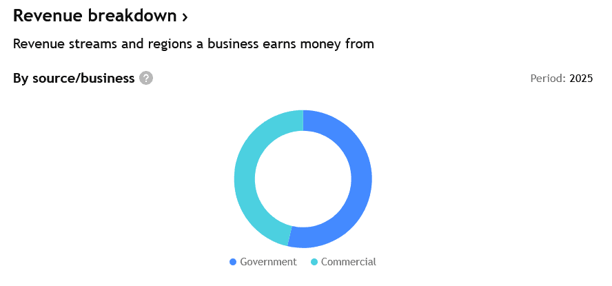 Složení příjmů Palantiru za rok 2025 – komerční a vládní zakázky.