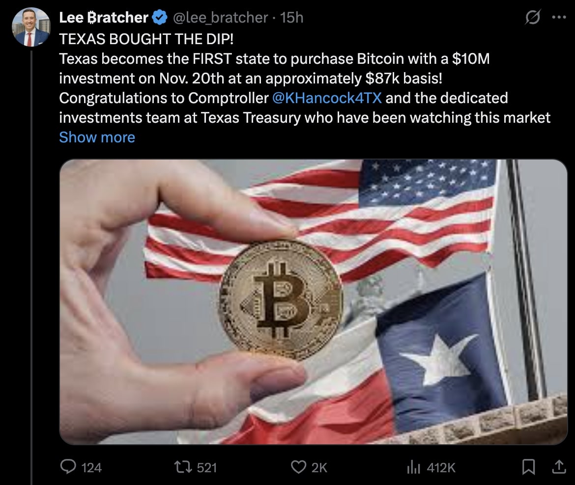 Prezident Texas Blockchain Council, Lee Bratcher, ocenil nákup v příspěvku na síti X. Podle něj stát správně využil pokles ceny a nakoupil Bitcoin za přibližně 87 tisíc dolarů.