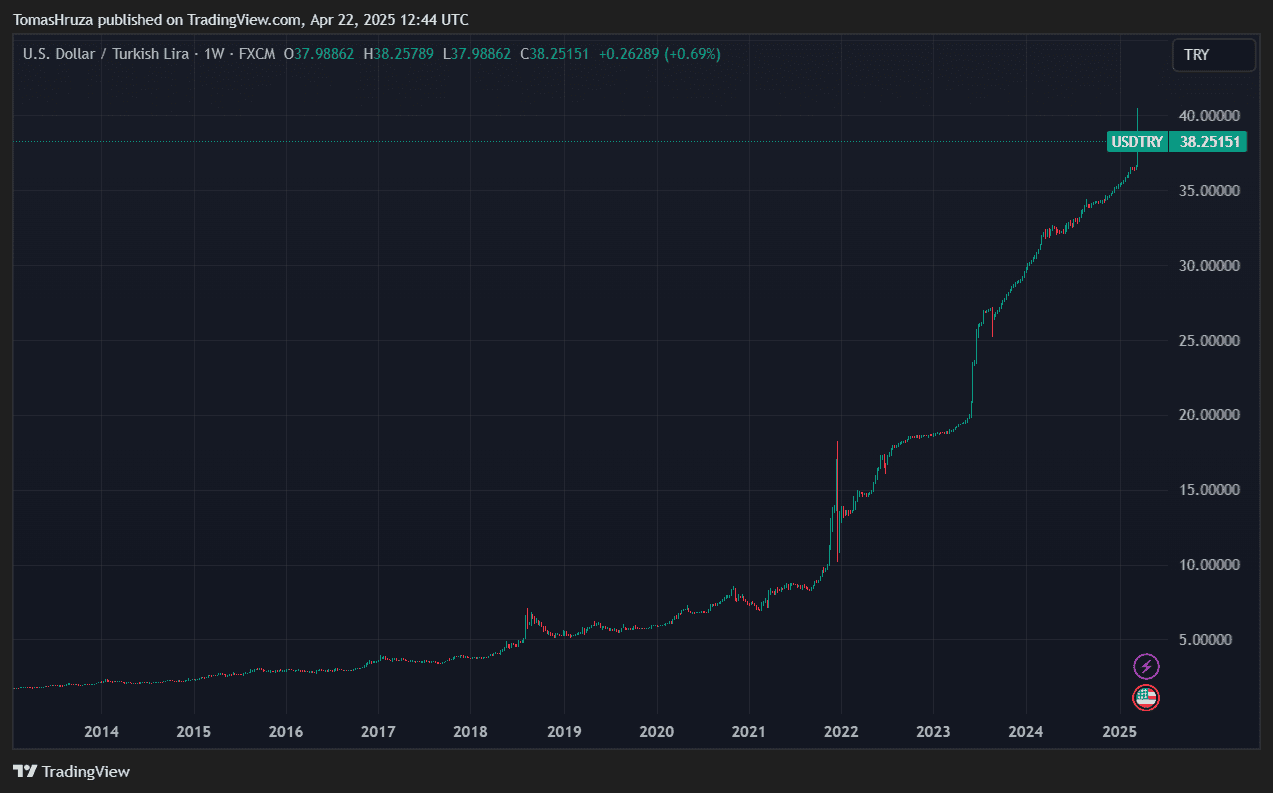 Lira se znehodnotila vůči dolaru až sedminásobně, neboť se z úrovně 5,3 dolarů propadla na 38 dolarů na páru USD/TRY.