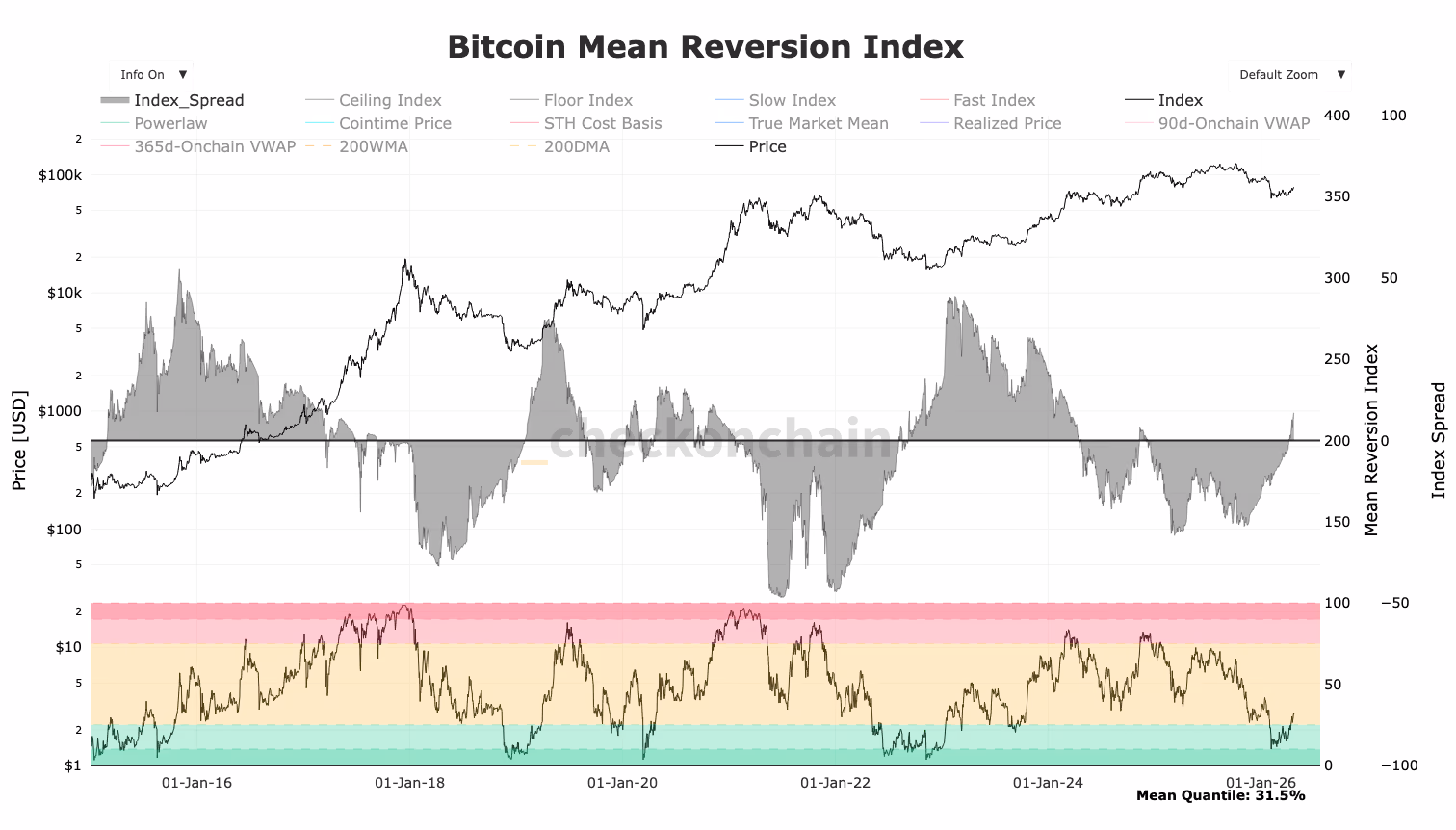 Bitcoin Mean Reversion Index kombinuje více metrik. Patří mezi ně například 200týdenní klouzavý průměr, realizovaná cena nebo power law trend.