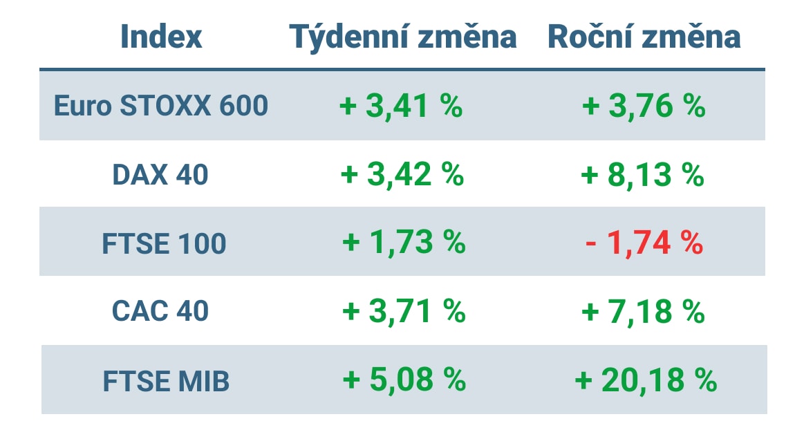 Celoevropský index STOXX Europe 600 se odrazil od ztrát z předchozího týdne a skončil týden o 3,41 % výše.