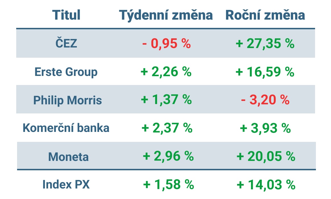 Týdenní růst byl nejvyšší od poloviny září a páteční závěrečná hodnota indexu byla nejvyšší od začátku května. Trh byl minulý týden ovlivněn především výsledkovou sezónou, přičemž v čele růstu stály akcie finančních společností – Erste Group, Komerční banka a Moneta.