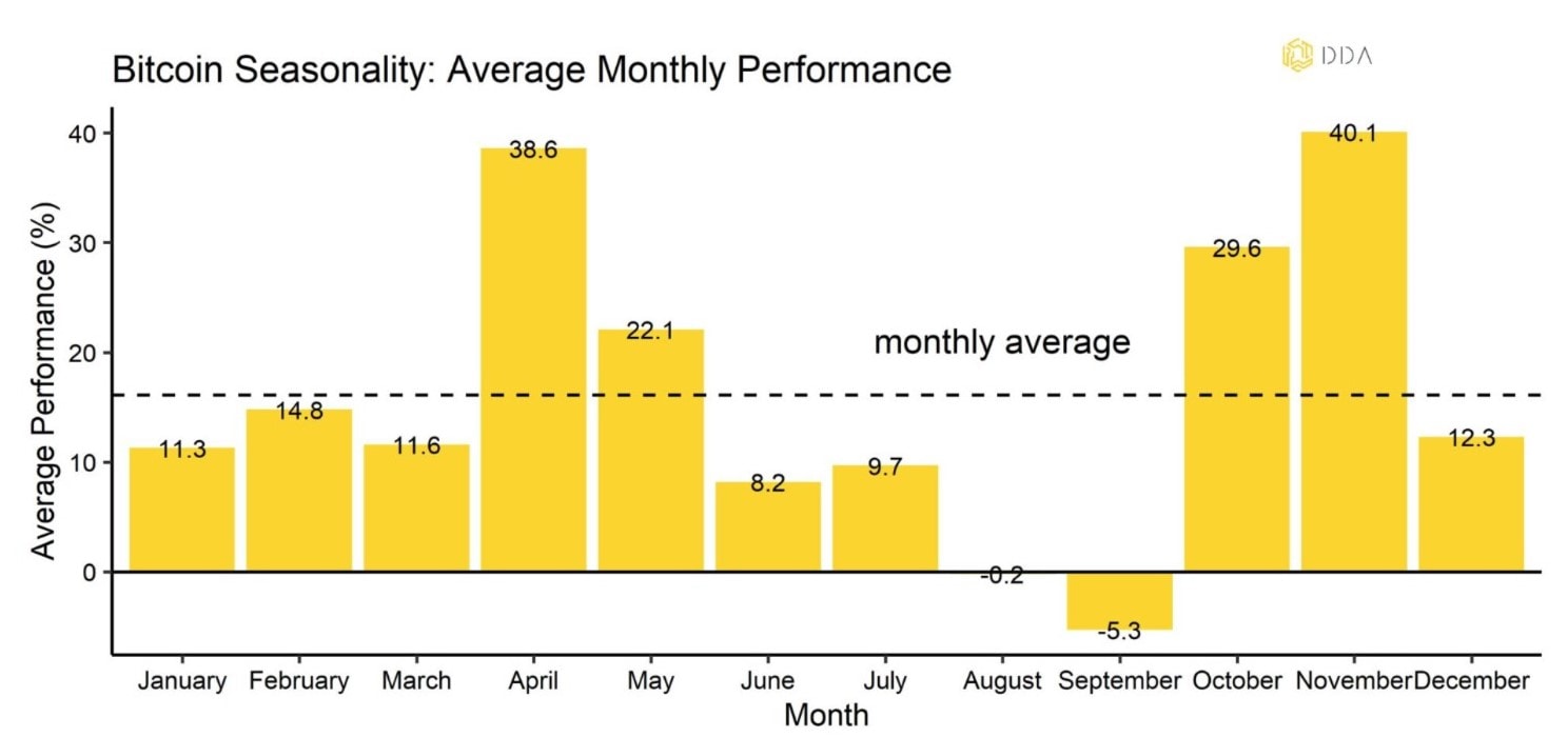 Z historického hlediska má Bitcoin v tomto měsíci nejvyšší průměrné výnosy. Překvapivé však je, že letos byl Bitcoin v kladných číslech i během měsíců září a říjen, což se stalo doposud jenom dvakrát v letech 2015 a 2016.