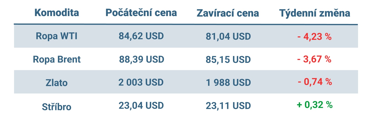 Globální benchmark pro ropu – ropa Brent – v minulém týdnu klesla o téměř 4 % a navázala tak na více než 3% pokles z předcházejícího týdne. Cena americké ropy WTI pak klesla o více než 4 %, čímž rovněž navázala na 3% propad z předchozího týdne.