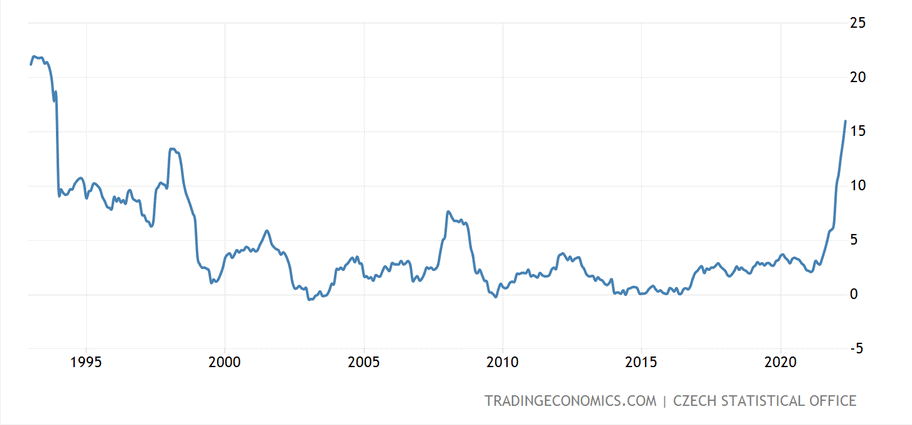 Bohužel je zase zřejmé, že prognóza tuzemské centrální banky je podceněná. Asi tři měsíce s nadsázkou tvrdím, že strop inflace bude 20 %. Za začátku jsem to říkal skutečně ze srandy. Ale postupně se potvrzuje, že se těm 20 % hodně přiblížíme. Snad je ovšem nepřekročíme. Jestli ano, tvrzení jednotlivých členů bankovní rady o naplnění inflačního cílování do konce roku 2023 budou ohrožená. Respektive radní tvrdí, že se těm 2 % bude česká ekonomika na konci příštího roku blížit.