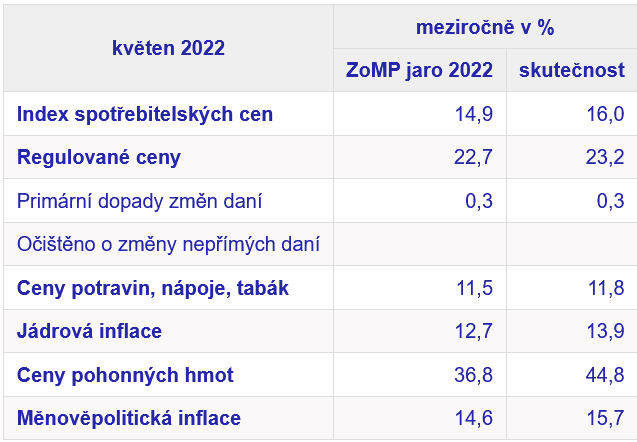 Květnový růst je znatelně nad jarní prognózou České národní banky (ČNB), která počítala s 14,9 %. Respektive květnový meziroční růst spotřebitelských cen byl ve srovnání s prognózou o více jak jeden procentní bod rychlejší.