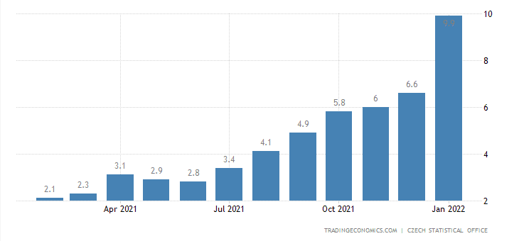 Už před měsícem bylo evidentní, že Česká národní banka kalkuluje s inflací blížící se 10 %. Což se následně potvrdilo i v jejich inflační prognóze. Na základě čerstvě zveřejněných dat inflace vzrostla v lednu 2022 meziročně o 9,9 %. Inflace tak oproti závěru loňského roku skutečně prudce zrychlila a nacházela se vskutku výrazně nad horní hranicí tolerančního pásma cíle tuzemské centrální banky. Z toho jádrová inflace dosahuje 9,7 %.