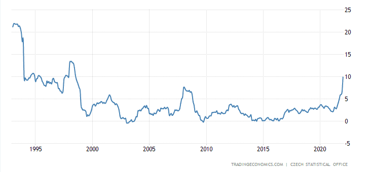 Nikdo ovšem určitě nepočítal s tím, že se k těm 10 % přiblížíme tak rychle. Nyní je prakticky jisté a přiznává to i člen bankovní rady Petr Král, že inflace těch 10 % určitě překoná. Čili budeme mít po mnoha letech tzv. pádivou inflaci, která je ve dvojciferných číslech. Pádivá inflace je skutečně nebezpečná, protože může v ekonomice “zakořenit” a měnová autorita může být donucena v mnohem razantnější kroky, aby inflaci dostala pod kontrolu.