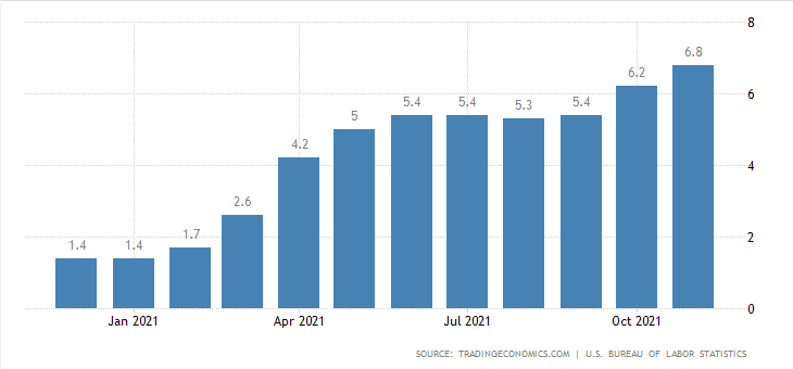 Čerstvě zveřejněná data ukázala, že inflace je ve Spojených státech za posledních 39 let vůbec nejvyšší. Její meziroční výše je za listopad 6,8 %. Není to sice dvojciferná hodnota, ale rozhodně se jedná o velmi vysoké číslo, které implikuje mnoho problémů. Tak vysoká inflace ukrajuje domácnostem z úspor a podnikům z marží. Jsou to zkrátka další náklady, které se dotknou všech ekonomických jednotek.
