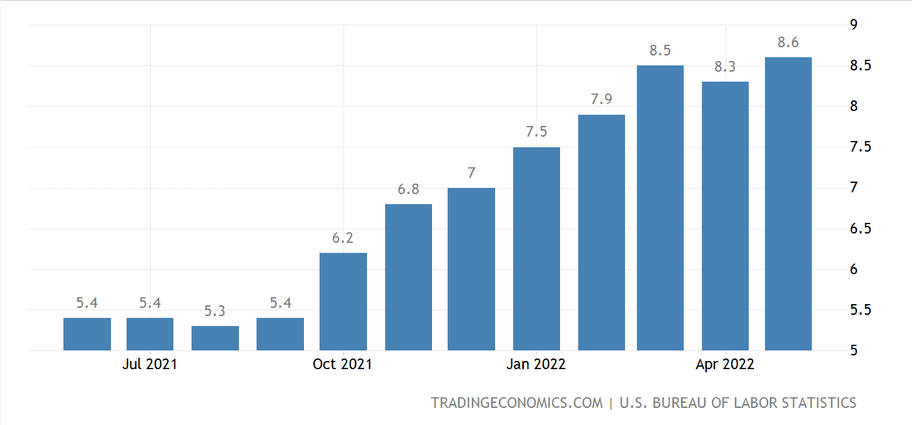 Inflace ve Spojených státech postoupila na vyšší úroveň. Květnová inflace se meziročně vyšplhala na 8,6 %, čímž se překonal dosavadní březnový rekord 8,5 %.