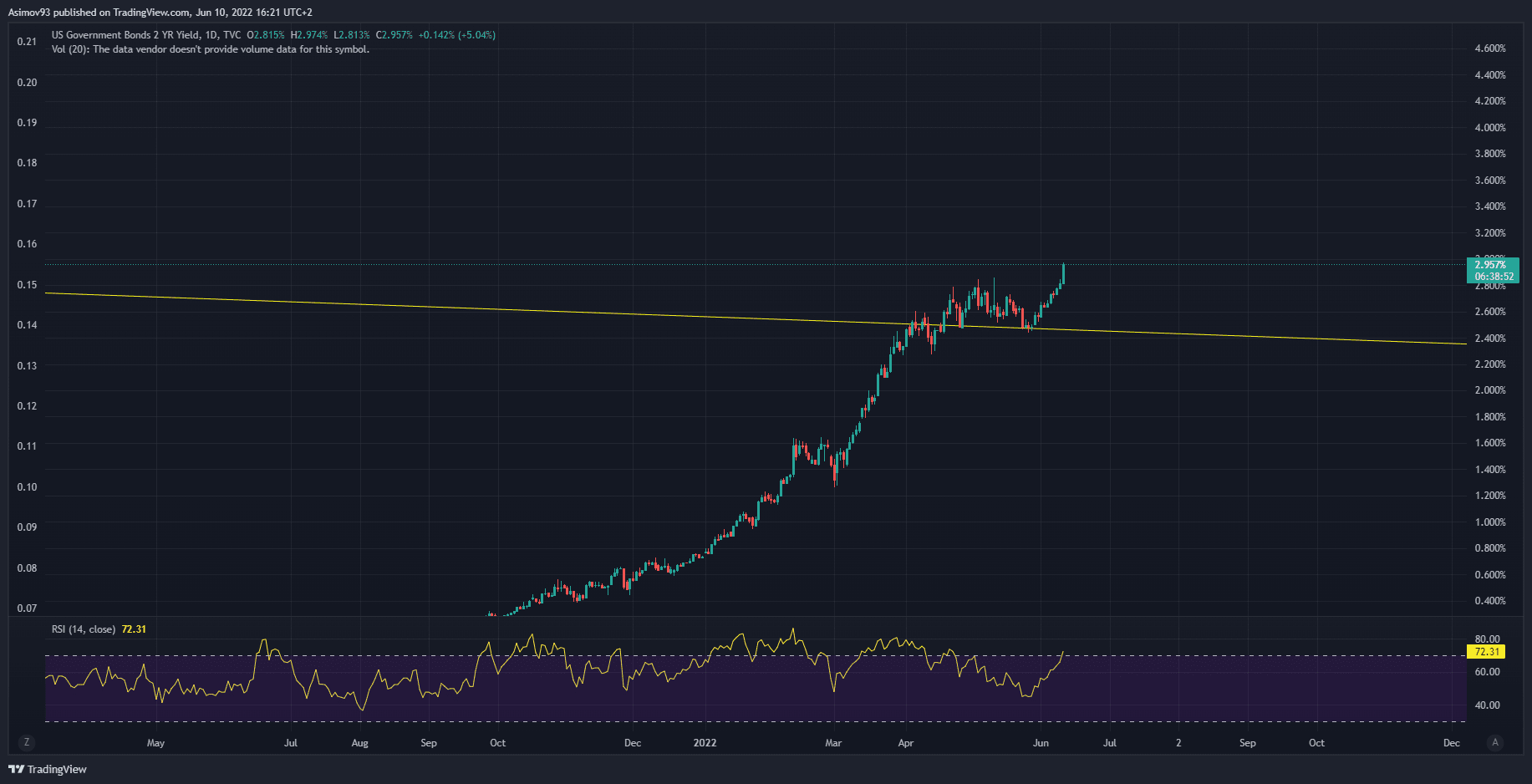Pro výnosy je to též vzpruha. Respektive výnosy na federálních dluhopisech po celé délce výnosové křivky rostou. Nejvíce na těch krátkodobých splatnostech. Proč? Protože akcelerující inflace implikuje růst základních úrokových sazeb. A růst základních úrokových sazeb znamená, že nové dluhopisy budou úročeny více. Proto se investoři zbavují aktuálních dluhopisů, což tlačí jejich tržní cenu dolů. A pokles cen na dluhopisovém trhu znamená růst úroků (výnosů). Respektive je u dluhopisů nepřímáúměra mezi výnosem a jeho cenou.