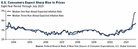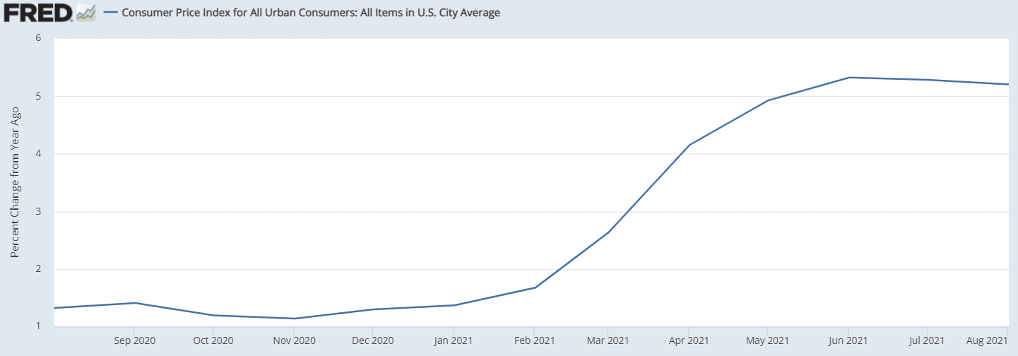 A zřejmě si toho všímají i spotřebitelé. Podle průzkumu spotřebitelských očekávání Federální rezervní banky New Yorku (Federal Reserve Bank of New York) americké domácnosti v srpnu očekávaly medián roční inflace na úrovních od 4,8 % (teď) po 3,7 % (za 3 roky). Tato očekáváníjsou velmivysoká. Jsou dokonce nejvyšší od roku 2013, kdy banka začala u spotřebitelů sledovat jejich inflační očekávání.