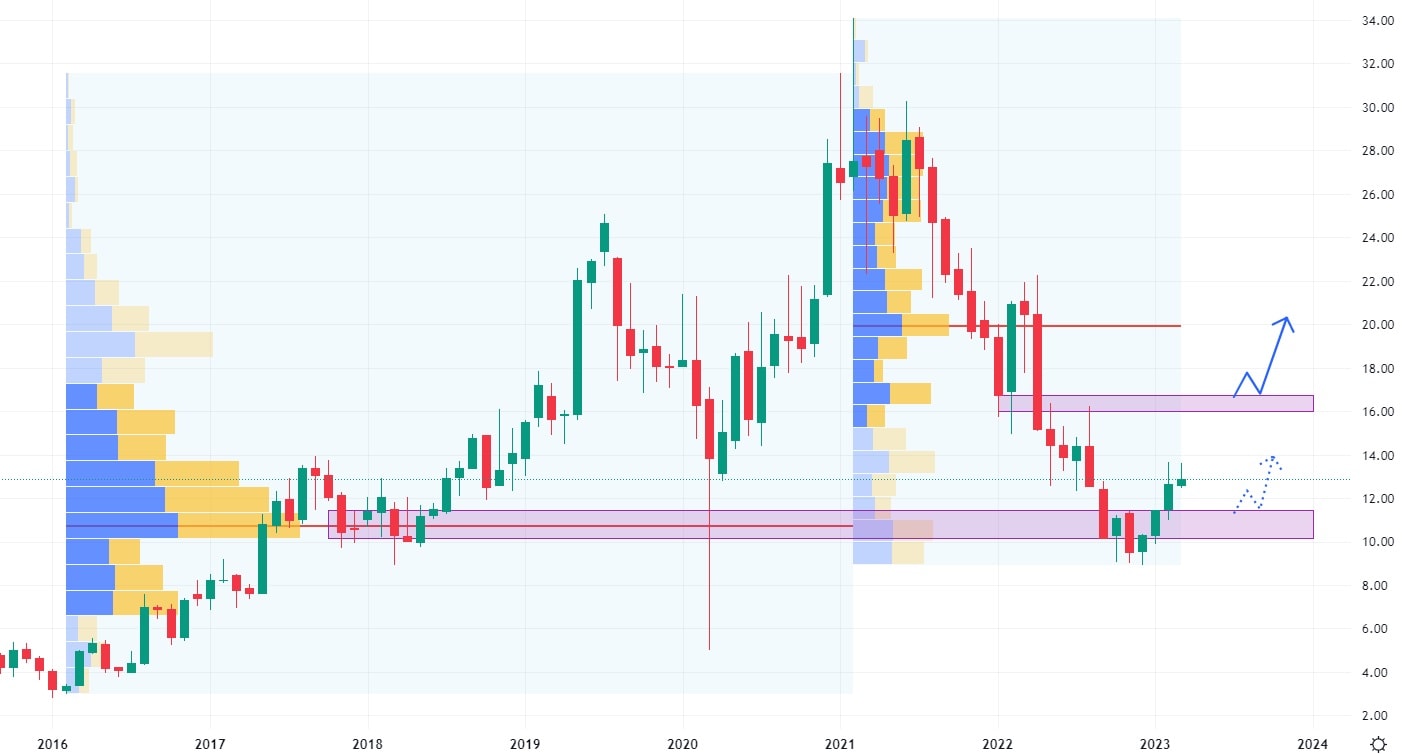 Silný cenový propad postihl akcie Kratos poté, co trh v loňském roce konsolidoval okolo svých historických maxim. Tento pád zastavila až hodnota nejsilnějšího volume od roku 2016, na které se trh v současné době nachází. Probíhající nákupní korekce, případně počátek nového trendu, může být předzvěstí pro vznik technické formaci pullback a následnému růstu. Ovšem pád akcií pod cenu 10 USD by znamenal pokračující prodejní trend.