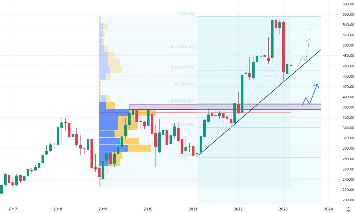 Akcie Northrop Grumman se obchodují ve strmém rostoucím trendu, který je podpořen trendovou čárou. V současné době se akcie obchodují právě na její hodnotě a to po poměrně silném cenovém propadu, který nastal po vytvoření historických maxim. Pokud bude rostoucí trendová čára pokořena, nejbližší support se nachází na ceně 380 USD, kde vzniká konfluence silného volume a 61,8 % Fibonacciho retracementu.