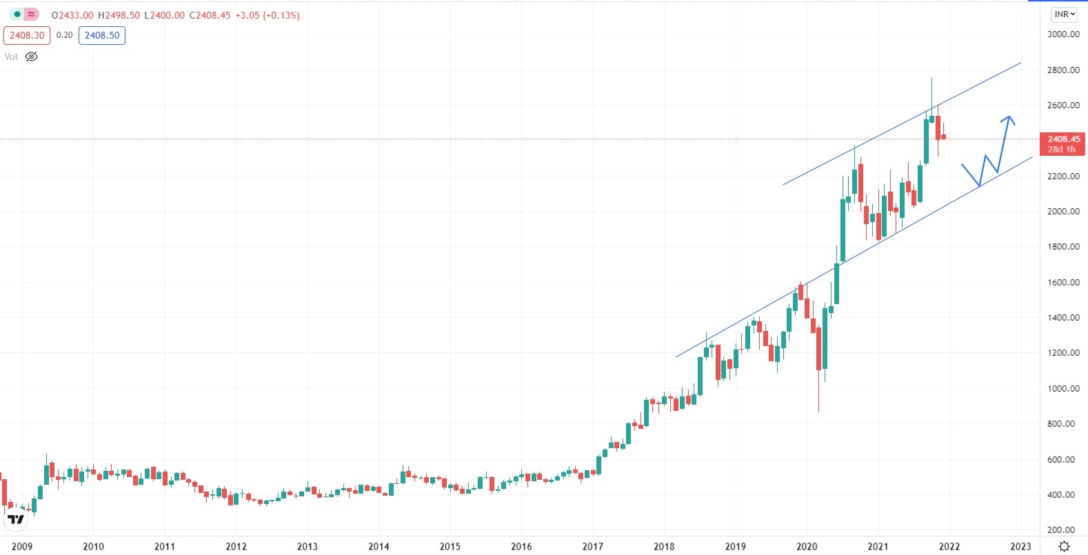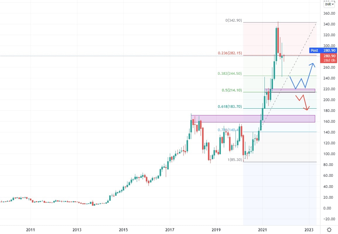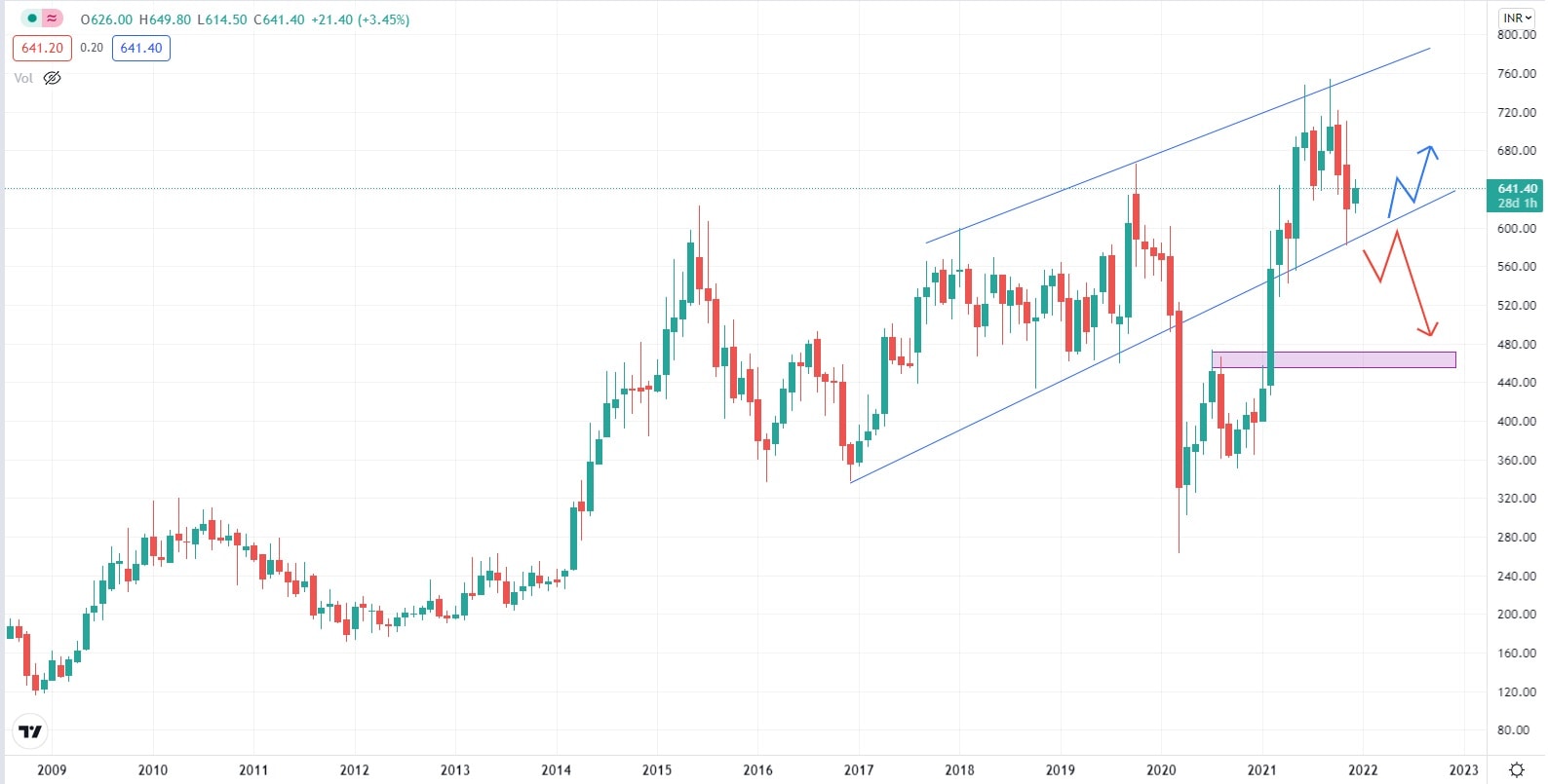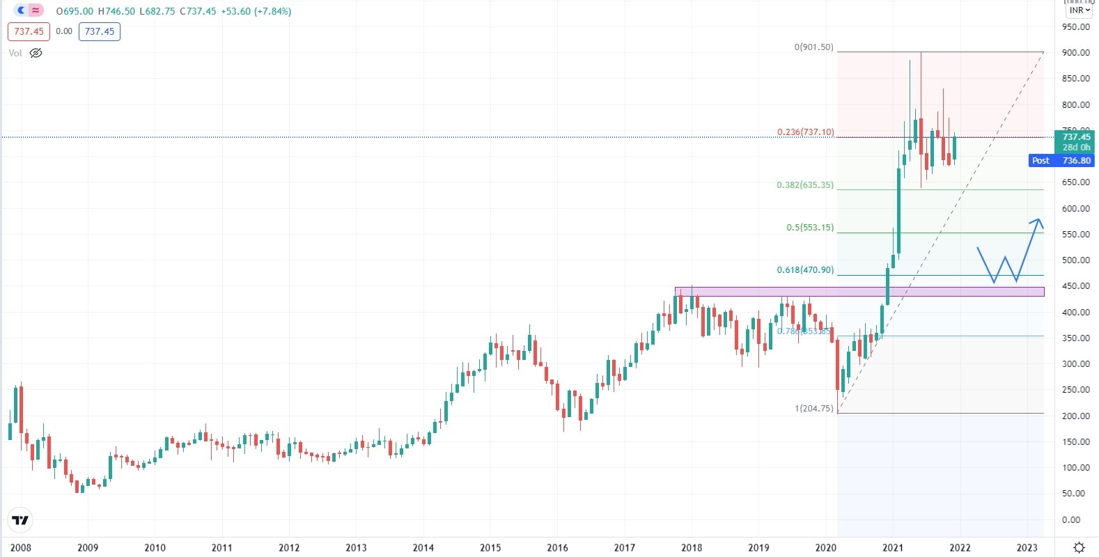 Akciový graf této indické společnosti vykazuje v roce 2021 zvýšenou volatilitu, která byla po většinu roku pro hodnotu akcií společnosti příznivá a pomohla jí dosáhnout svých dosavadních historických maxim. Akcie společnosti se obchodují nad supportní úrovní, podpořené Fibonacciho Retracementem 50 %. Z investičního pohledu by v současné době bylo vhodné, aby se cena akcií ustálila, snížila se volatilita, což by společnosti umožnilo se soustředit na udržení si své podnikatelské pozice a zároveň pomohlo opět nastartovat nové investiční projekty.
