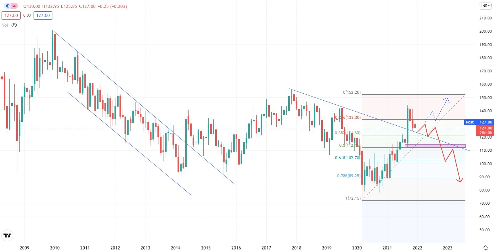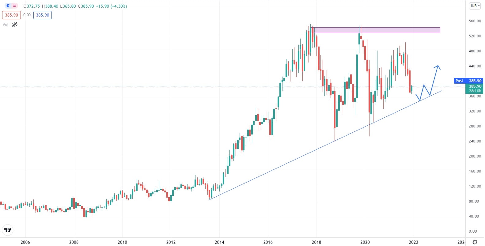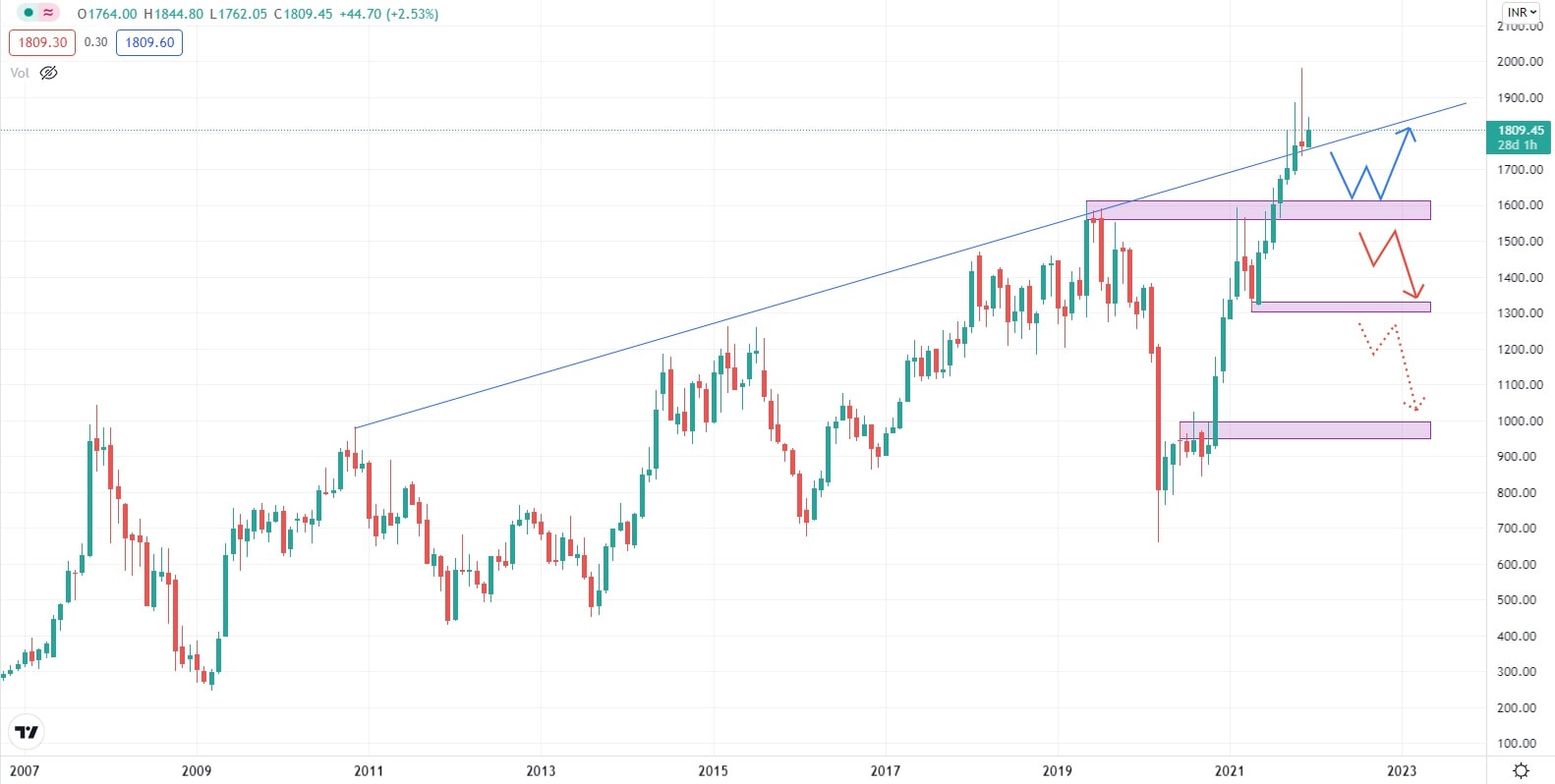 Akciový graf této indické společnosti vykazuje v roce 2021 zvýšenou volatilitu, která byla po většinu roku pro hodnotu akcií společnosti příznivá a pomohla jí dosáhnout svých dosavadních historických maxim. Akcie společnosti se obchodují nad supportní úrovní, podpořené Fibonacciho Retracementem 50 %. Z investičního pohledu by v současné době bylo vhodné, aby se cena akcií ustálila, snížila se volatilita, což by společnosti umožnilo se soustředit na udržení si své podnikatelské pozice a zároveň pomohlo opět nastartovat nové investiční projekty.