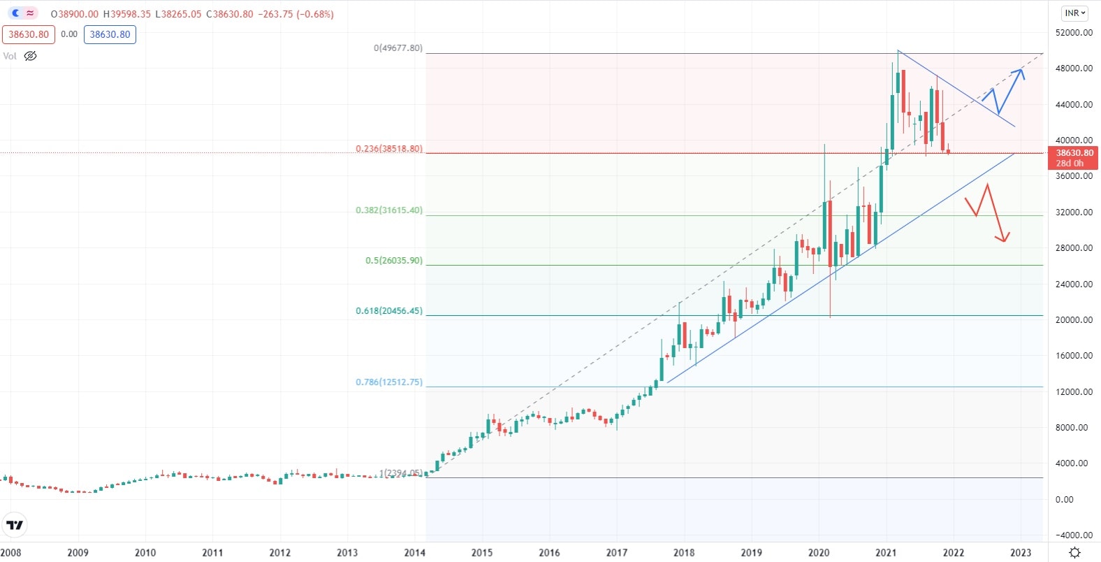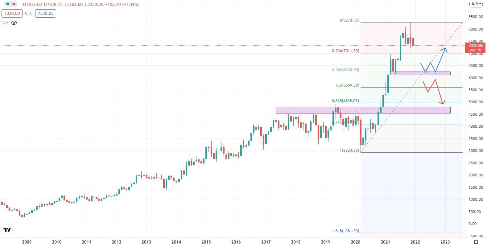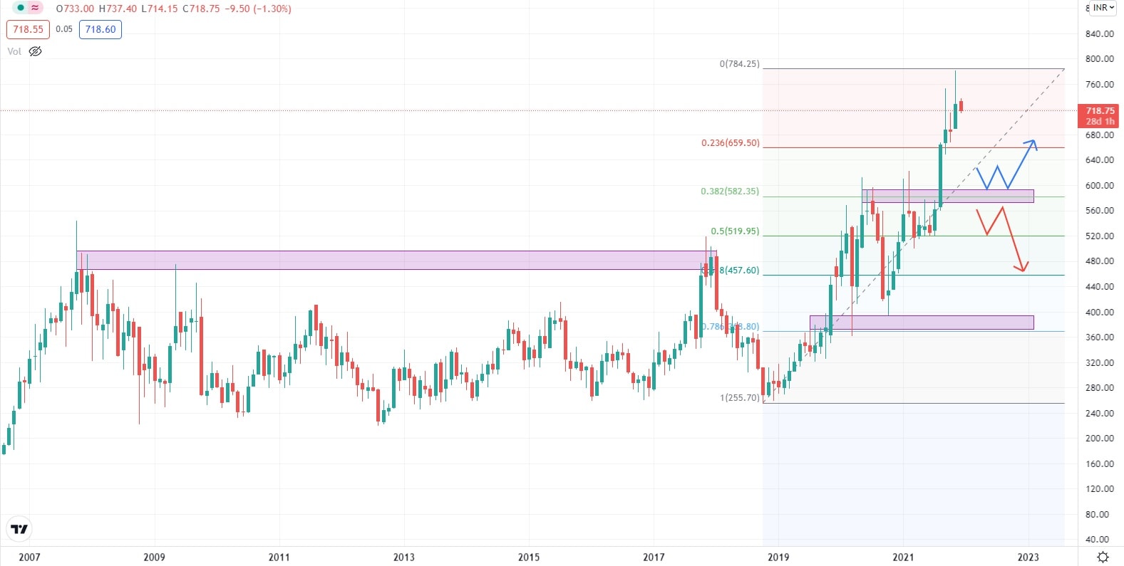 Za poslední dva roky vykázala cena akcií společnosti Adani bezmála 340 % nárůst své hodnoty. Nejbližší supportní úroveň se nachází poměrně daleko od současné obchodní ceny. Její dosažení by pro společnost znamenalo smazání velké části zisků, plynoucích z nárůstu hodnoty jejich akcií. Po silném růstu lze většinou očekávat postranní trend a kumulaci obchodních příkazů, což může v současné chvíli, a při pozitivním fundamentu, znamenat klid před bouří, a dalším růstem hodnoty akcií.