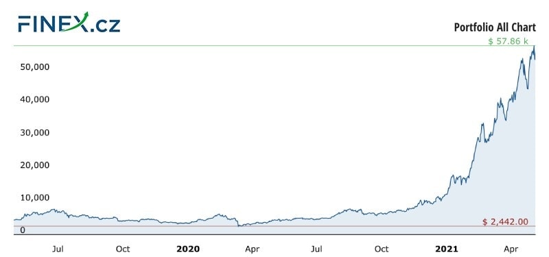 Už od února se cena Bitcoinu prakticky moc nezměnila. Od doby, kdy 16. 2. 2021 poprvé překročila psychologickou hranici 50 000 dolarů za 1 bitcoin, zaznamenala sice pár poklesů i pádů, ale v době psaní tohoto článku se stále pohybuje okolo 53 000 USD. Hodnota našeho portfolia i přesto od února stále stoupá, a to hlavně kvůli sílícím alternativním kryptoměnám, které byly v našem portfoliu ze začátku zastoupeny z 80 % (teď je to 84 %).