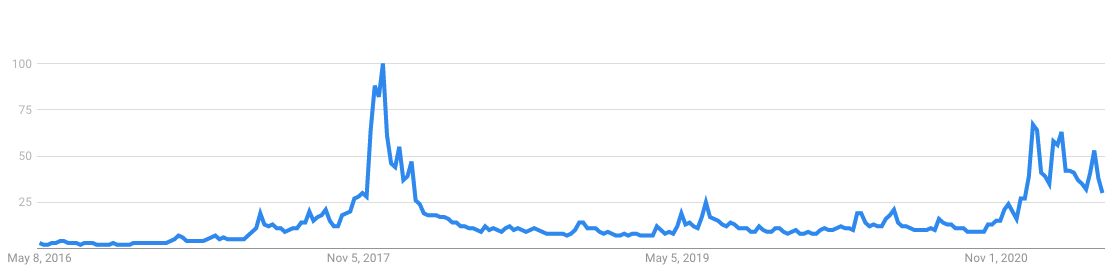 Aktuální vývoj počtu hledání slova Bitcoin v porovnání s “bublinou” v roce 2017