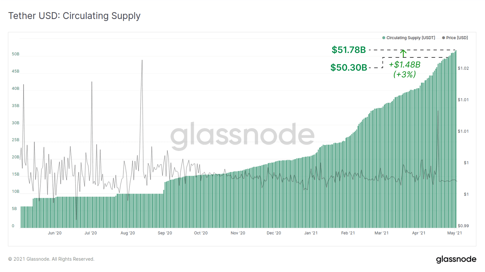 Počet mincí USDT v cirkulaci je každým dnem větší a růst jejich zásoby stále zrychluje. Je tak jasné, že celý ekosystém se stále ještě nafukuje.