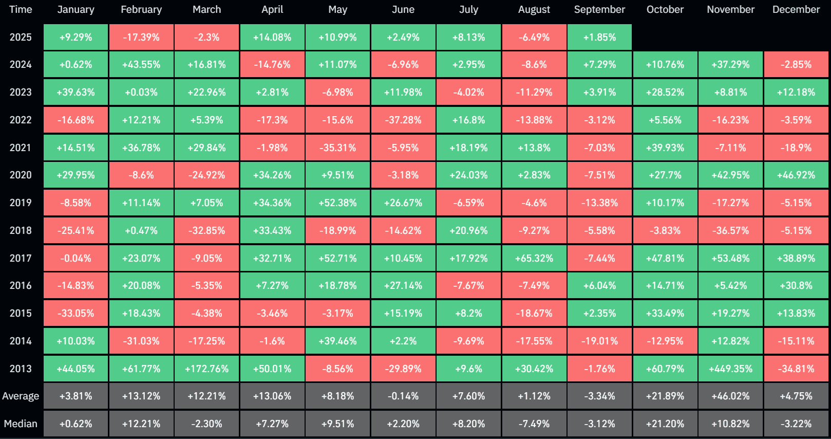 Září je historicky nejslabším měsícem Bitcoinu, zatímco zlato dnes dosáhlo nových maxim. Jak lze vidět níže na obrázku, BTC se průměrně během tohoto měsíce propadá o 3,3 %.