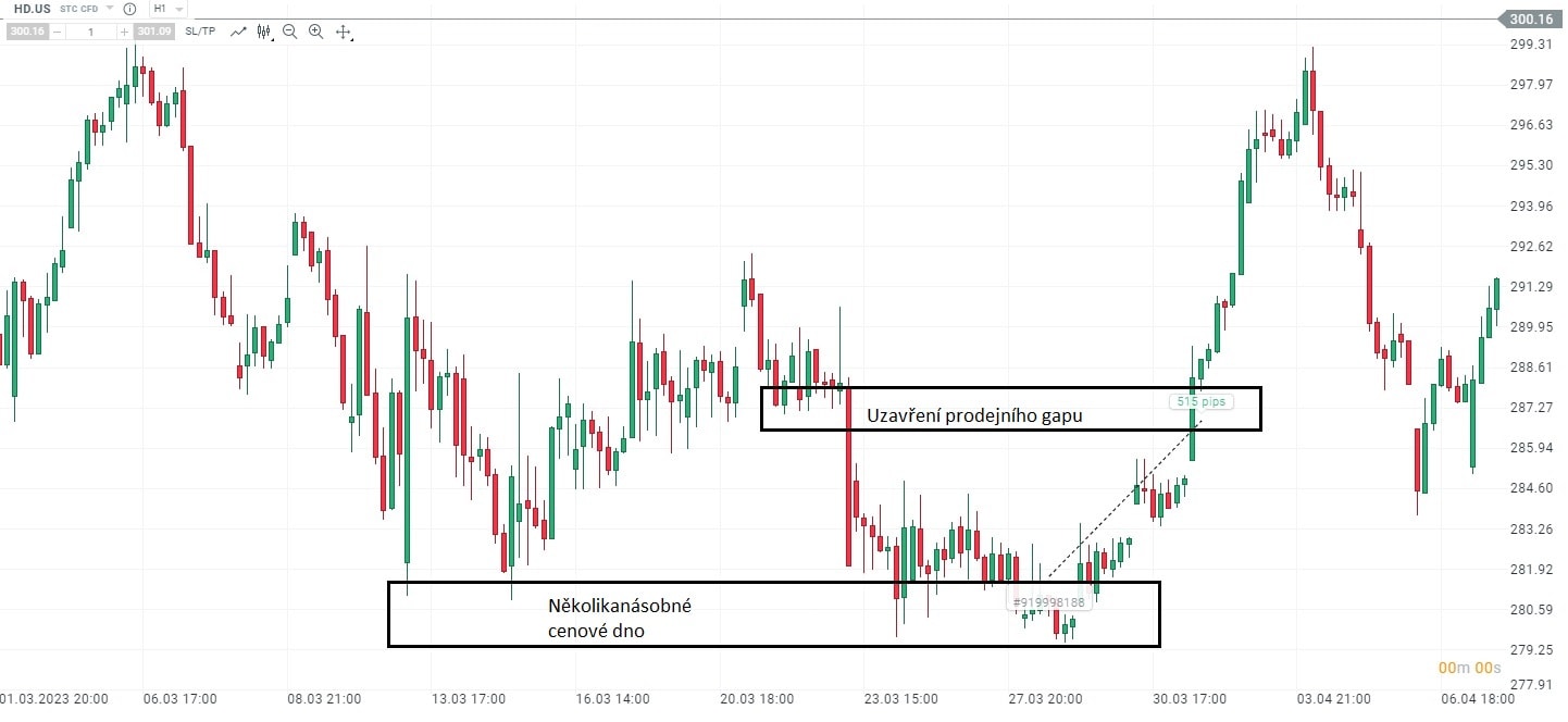 Akciový graf společnosti HP s ukázkou spekulativního long obchodu