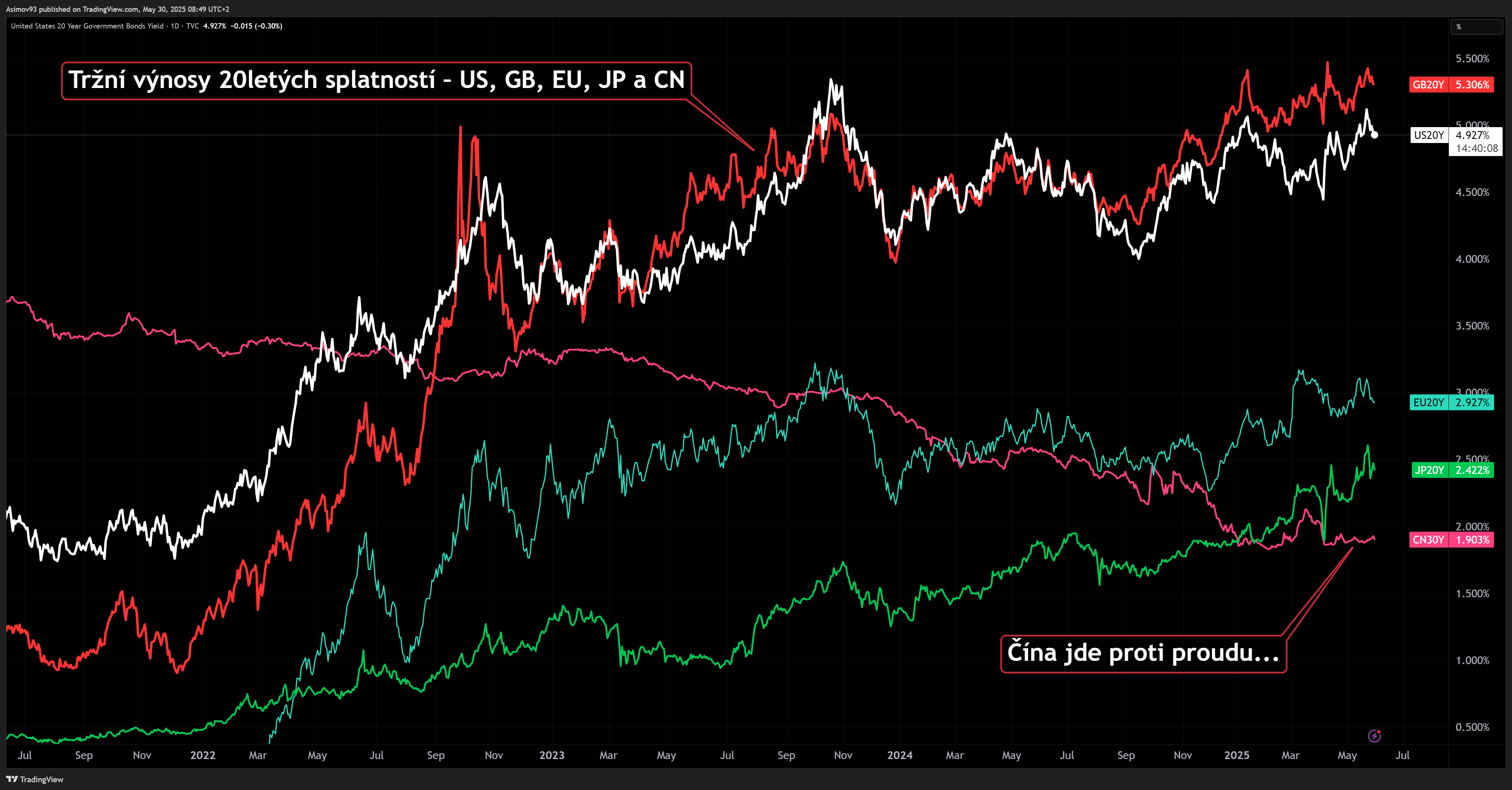 Tržní výnosy státních dluhopisů největších ekonomik na delším konci výnosové křivky